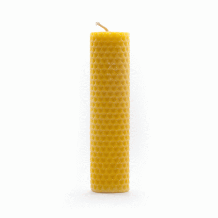 Svíčka ve tvaru válce, kterou sami ručně vyrábíme z našeho 100% včelího vosku.